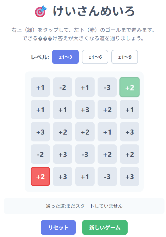 けいさんめいろ 計算迷路 1年生 X Facebook はてブ Pocket LINE コピー 2026.01.01右上(緑)をタップして、左下(赤)のゴールまで進みます。 できるだけ答えが大きくなる道を通りましょう。 けいさんめいろ